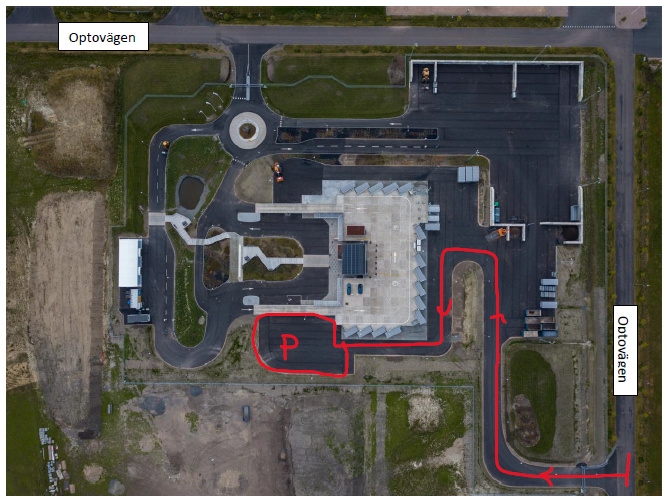 Kör in via vår personalgrind, på anläggningens nordvästra sida mot E22, alltså inte ordinarie besöksgrind. Grinden öppnas när automatiskt när ni kommer. Efter att ni parkerat, gå upp för rampen till sorteringsplattan, vi finns på tredje våningen i Returum-huset.