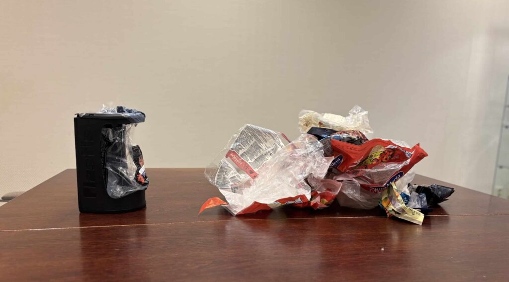 Mjuka plastförpackningar innehåller ofta mycket luft. Genom att samla förpackningarna i en mindre plastpåse – till exempel en tom brödpåse – och sedan pressa ihop den med hjälp av plastminimeraren minskar volymen rejält.
